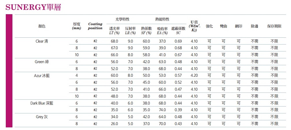 Sunergy Low-E節能玻璃因應當代建築設計的所有難題及挑戰而生。Sunergy擁有低反射、中性的自然原色表現,且設計彈性、容易安裝,因此深受全球建築業者喜愛。可使用於各種複雜的結構設計,包括創新弧形外觀、可使用加熱強化製程、可用於建築正面外觀、可單片或 層安裝使用、也可使用網印。 Sunergy具備高水準熱能控制以及隔熱功能,提供清透、綠色、冰藍、深藍及灰色5種顏色選擇。
