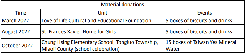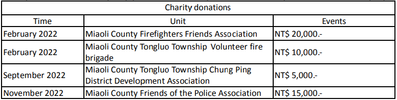 1. At present, the Company performs its corporate social responsibilities mainly by donating money and materials to neighborhoods, social welfare groups and schools.